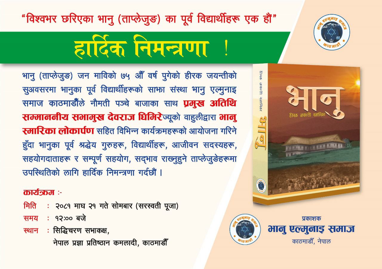 साथै बैठकले काठमाण्डौमा रहनुहुने सम्पूर्ण भानुका पूर्व विध्यार्थीहरु र ताप्लेजुङेलाई आगामी माघ २१ गते नेपाल प्रज्ञा प्रतिष्ठानमा मध्यान्न १२ वजे कार्यक्रममा उपस्थित जनाईदिनुहुन सवैलाई खुल्ला आव्हान गर्यो ।
